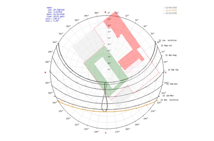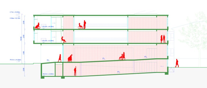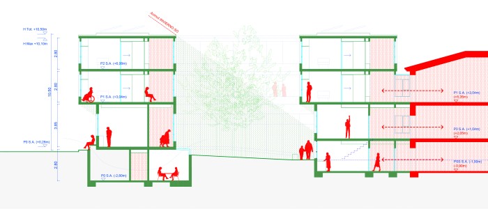 La organización del programa, pero sobre todo de las habitaciones, parte de que todas y cada una de las ellas tengan orientación a suroeste para poder ver el atardecer, lo que genera una volumetría y un recorrido cubierto alrededor de un jardín-bosque (se preservan los árboles que existen), donde los abuelos pueden andar y mantenerse en forma, evitando los recorridos lineales de ida y vuelta. Paseamos, saludamos a los vecinos y contemplamos el horizonte, permitimos que el entorno nos inspire, regando espacios expuestos al sol de invierno pero también con vistas, poder mirar arriba al cielo y ver qué día hace, así como asomarse al balcón y ver cómo juegan los niños en la escoleta de al lado.