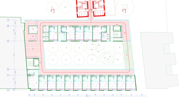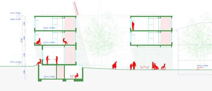 Se plantea cada planta de habitaciones (hogar) como un circuito plano y accesible para poder andar y mantenerse en forma, evitando los recorridos lineales de ida y vuelta. Paseamos alrededor de un bosque, saludamos a los vecinos y contemplamos el horizonte, permitimos que el entorno nos inspire, regando espacios expuestos al sol de invierno pero también con vistas a los jardines, poder mirar arriba al cielo y ver qué día hace, así como asomarse al balcón y ver cómo juegan los niños en la escoleta de al lado.